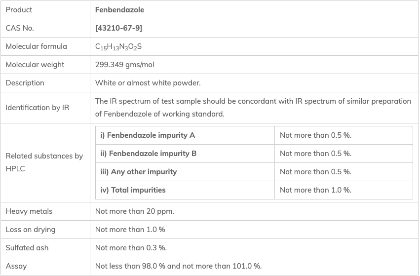 Fenbendazole is a drug substance classified under the category ‘Anthelmintic Agent’ (for veterinary use) .It is used in the treatment & control of fluke infections of the digestive system caused by roundworms , tapeworms , hookworms , lungworms which are generally found in Cats , Sheeps, Goats ,Pet birds , Pigeons. Hence this drug is an effective de-wormer in animals. The information given above is based on our current knowledge and should not be considered as an intention of our Company to provide any medical information or as an advice for animal specific treatment. For any medical attention for your animals, livestock, we advise our customers to consult a Veterinarian/ Veterinary Doctor and act as per his advice.